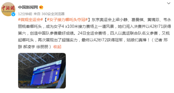 东京奥运会上梁小静、葛曼棋、黄瑰芬、韦永丽梳着哪吒头,成为女子4 x100米接力赛场上一道风景,她们闯入决赛并以42秒71获得第六,创造中国队参赛最好成绩。24日全运会赛场,四人以奥运联合队名义参赛,又梳起哪吒头,再次展现出了超强实力,最终以42秒72获得冠军,姑娘们真棒!
