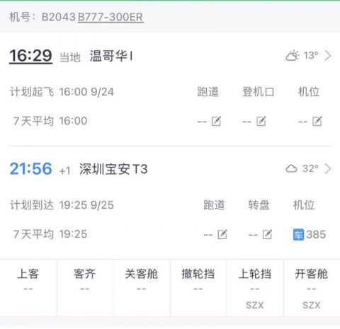 根据温哥华机场信息,当时地间9月24下午16时,由中国国际航空临时执行CA552航班,将从温哥华飞往深圳。之后,该航班于16时29分起飞。查询有关飞行计划显示,该航班将于北京时间9月25日晚抵达深圳。进一步查询深圳宝安机场航班信息显示,北京时间9月25日晚21时50分,从温哥华飞来的CA552将抵达深圳。