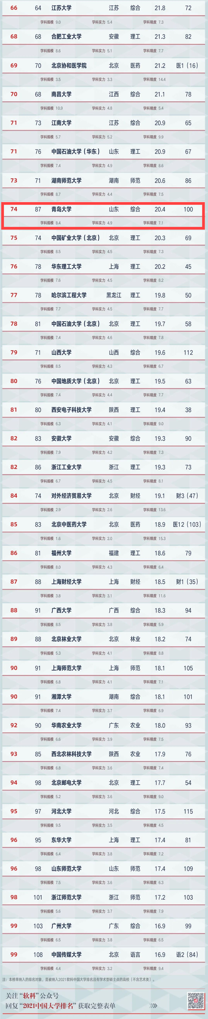 青岛大学位列全国第74位!2021软科中国大学学科水平排名发布