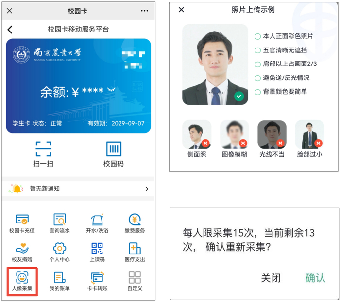 上传照片方法:进入【智慧南农】微信公众号—【校园卡】—【人像采集】,按要求提交一张较清晰的本人正面照。学校会严格保护个人信息、确保信息安全。