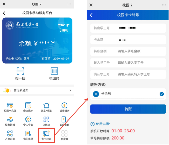 Tips 1:不方便自行充值时,还可以找朋友“江湖救急”!通过【卡卡转账】进行校园卡余额的相互划转,但目前仅支持学生和临时人员使用此功能,教师只能接收,不能转出。