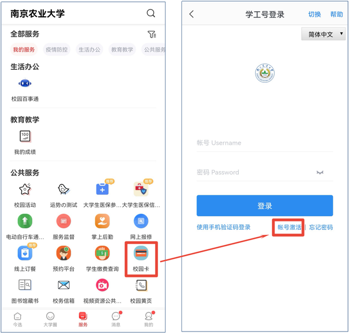 途径2:下载安装【今日校园】APP,选择【学工号登录】,选择学校【南京农业大学】,在服务中选择【校园卡】后进行【账户激活】,输入统一身份认证的用户名、密码进行登录,即可启用虚拟校园卡。
