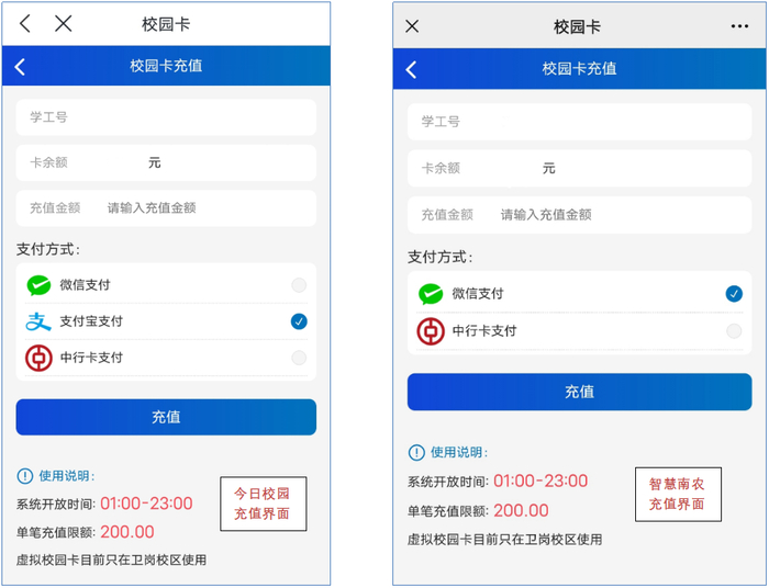 【智慧南农】公众号:仅支持微信、中行卡充值。