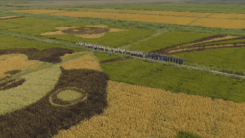 在横沙岛上,“海岛艺术田园”景区的水稻画和五彩花海一直吸引着各地游客前来观赏。今年,稻田画中迎来了新成员——华东师大土壤改良示范现场发挥横沙“稻田画”特色品牌优势,通过播撒不同品种的稻种来“作画”,特别为70周年校庆设计了图案为“小花狮”的稻田画。