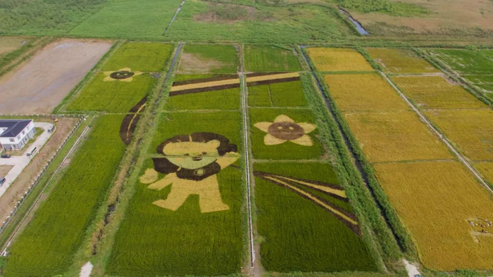 在横沙岛上,“海岛艺术田园”景区的水稻画和五彩花海一直吸引着各地游客前来观赏。今年,稻田画中迎来了新成员——华东师大土壤改良示范现场发挥横沙“稻田画”特色品牌优势,通过播撒不同品种的稻种来“作画”,特别为70周年校庆设计了图案为“小花狮”的稻田画。