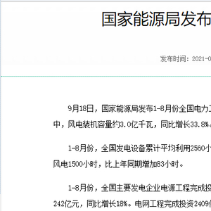 1-8月份,全国发电设备累计平均利用2560小时,比上年同期增加112小时。其中,核电5219小时,比上年同期增加338小时;风电1500小时,比上年同期增加83小时。
