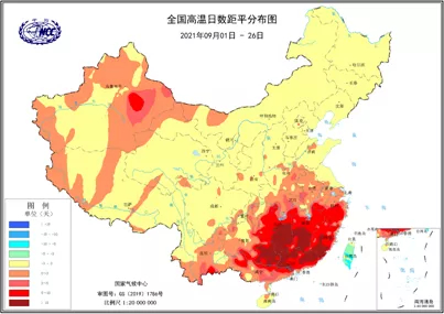 2021年9月1日-26日全国高温日数距平分布图。国家气候中心供图