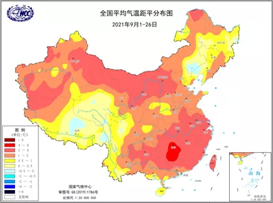 2021年9月1日-26日全国平均气温距平分布图。国家气候中心供图