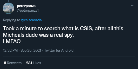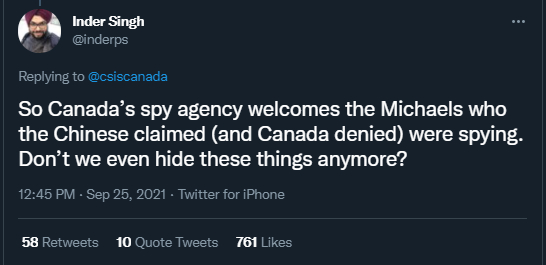 9月25日,在中国涉嫌间谍罪的加拿大公民斯帕弗和康明凯以取保候审返回加拿大。当天,加拿大情报机构发文欢迎他们“回家”。这操作楞是把很多推特网民看笑了。有加拿大人惊呼,难道我们都不隐瞒了吗?