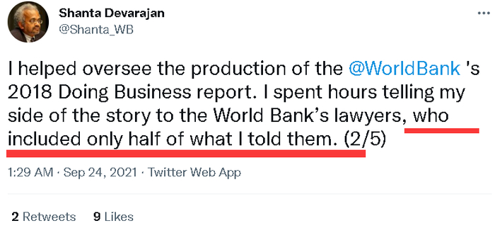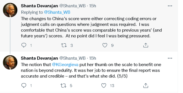 另外,德瓦拉杨还在帖文中表示,当年他在负责制作2018年版的“全球营商环境报告”时,并没有感受到任何来自格奥尔基耶娃或其他人要求“篡改数据”或“提高中国排名”的压力。而且,他也没觉得更改中国的数据有什么不妥。