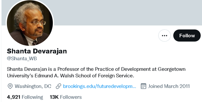 如下图所示,这位世界银行的前高级官员名叫尚塔·德瓦拉杨(Shanta Deverajan),曾是世界银行发展经济学研究部的高级主任,也是2018年版“全球营商环境”报告的主要经手人。目前他在美国乔治敦大学担任教授。