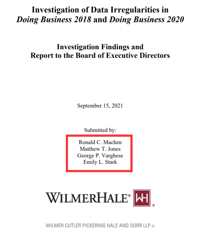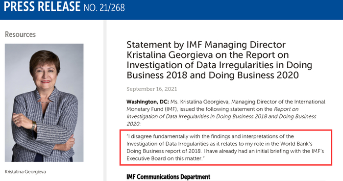 一家受世界银行委托调查此事的美国律所,发布了一份16页的调查报告,不仅指控中国官员在2017年时给世界银行“施压”,要求抬高中国在2018年版“全球营商环境报告”中的排名,还指控时任世界银行的CEO,如今担任国际货币基金组织(IMF)总裁的格奥尔基耶娃(Kristalina Georgieva),亲自给“全球营商环境报告”的制作团队施压,“迫使”该团队“篡改数据”,“提高”了中国的排名。