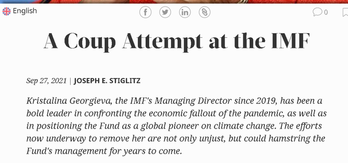 最后,就在今天(9月27日),认为格奥尔基耶娃被美国律所“恶意诽谤”的世界银行前首席经济学家斯蒂格利茨,在《报业辛迪加》的一篇文章中抛出了一个“爆炸性”的观点,称此事背后可能涉及世界银行以及IMF内部的某种“政变逼宫”,是一群对格奥尔基耶娃不满的人想要搞走她。