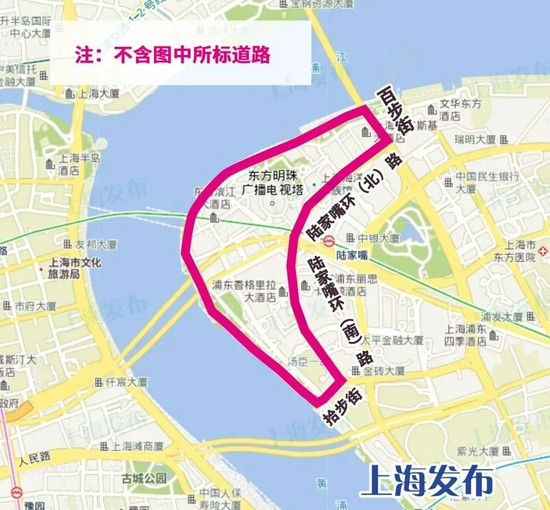 沿百步街—陆家嘴环(北)路—陆家嘴环(南)路—拾步街及黄浦江边所围合区域内的道路(不含上述道路),禁止机动车通行。