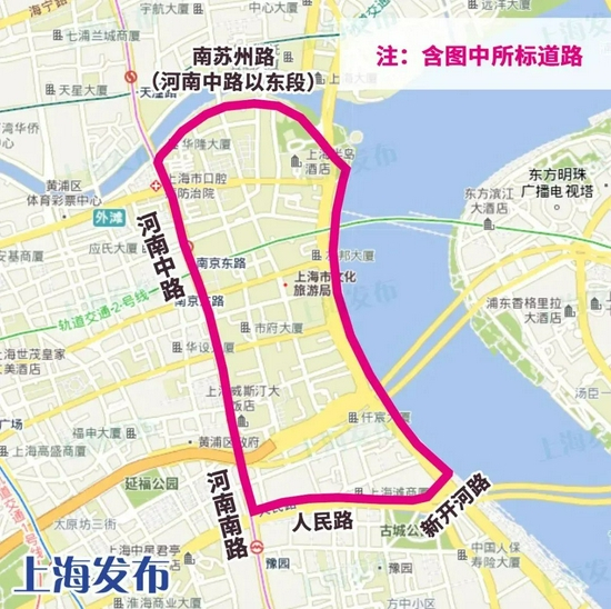 沿南苏州路(河南中路以东段)—河南中路—河南南路—人民路—新开河路及黄浦江边所围合区域内的道路(含上述道路),禁止非机动车通行。