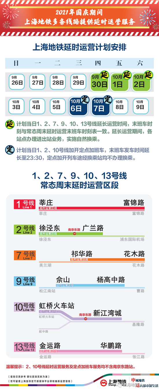 其中,9月30日-10月2日,上海地铁1、2、7、9、10、13号线将延时运营;9月30日20:00起、10月1-7日16:00起南京东路站将临时封站;长假末期的10月6、7日,1、2、10号线将加开夜间定点加班车,全力疏解返程大客流。