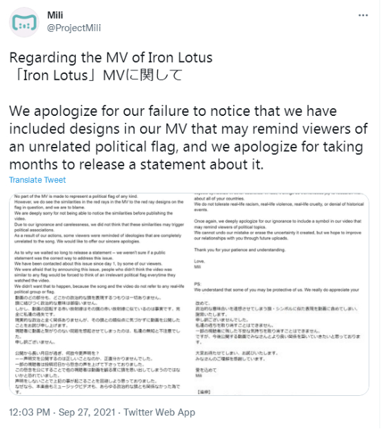 在道歉声明中,该日本音乐团体称:“MV画面并不是在描绘旭日旗。视频的任何内容都没有想要体现政治性旗帜,没有政治性意图”,但是“视频内容中画着红色放射状线条的部分存在与旭日旗相似的部分是事实。这完全是我们的过失”,“在没有注意到存在和旭日旗类似画面的情况下将视频公开,对此深表歉意。是我们的无知和疏忽导致让观看者联想到与视频无关的问题,非常抱歉”。