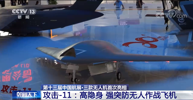 总台央视记者 李厦:一进展厅大门口,最显眼的就是这4架大比例的战鹰模型,其中有我们熟知的歼-20、运-20和直-20。有一架最特殊的战鹰,就是这架造型奇特的攻击-11隐身无人机。它是一个无尾翼式的布局,这款无人机具有隐蔽穿透、自主作战、高杀伤力等特点,能够在高威胁强对抗的环境下,对敌人纵深目标实施精确打击。这也是攻击-11无人机首次在中国航展亮相。