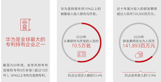 而2020年,华为的研发投入再创新高,达到1419亿元人民币,占全年收入的15.9%。至此,近十年累计投入的研发费用超7200亿元。