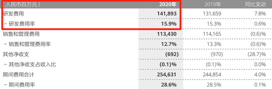 年报中表示,华为2020年坚持对5G、云、人工智能及智能终端等面向未来的研究创新,及保障业务连续性等方面持续投入,研发费用率上升0.6个百分点。
