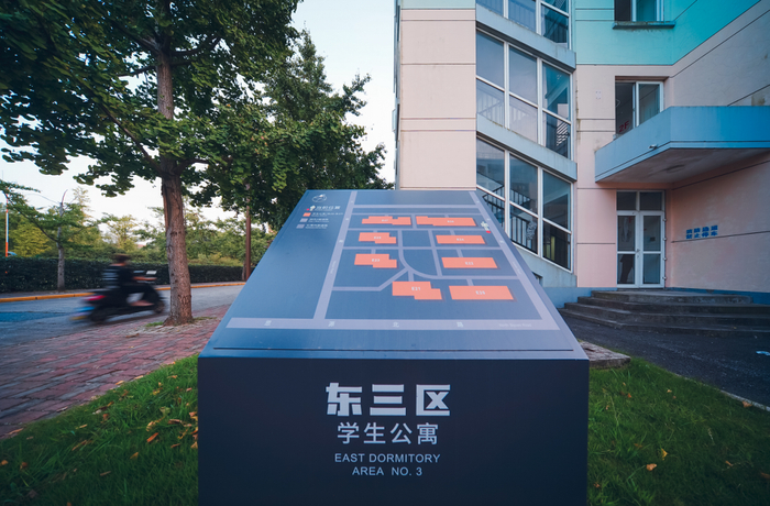 项目采用分批次落地的方式,对校园内的导视标识系统进行全面更新。不仅有校区大范围的全区地图、多项指示牌、路牌等,也有小范围的宿舍区指引牌、停车牌等。原本的闵行校区路牌大多为绿色,本次更新改造过程中,路牌设计主要参考《城市道路路名牌》上海市地方标准DB31/T 416-2008中市政路牌的配色,上部为蓝底白字,下部为白底黑字,配以交大红校徽元素,在与市政路牌统一的基础上,也展现了学校标识特色。