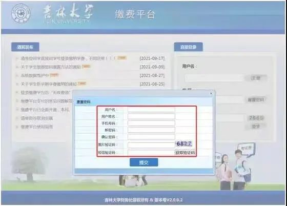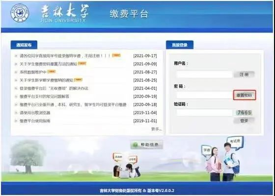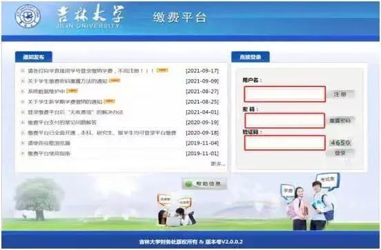 新生重置密码后通过录入用户名(学号)、密码、验证码进入吉林大学缴费平台缴费页面;