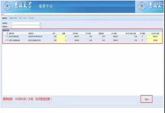 进入缴费页面,请仔细核对缴费项目与金额,确认无误后勾选缴费项目,点击“支付”;