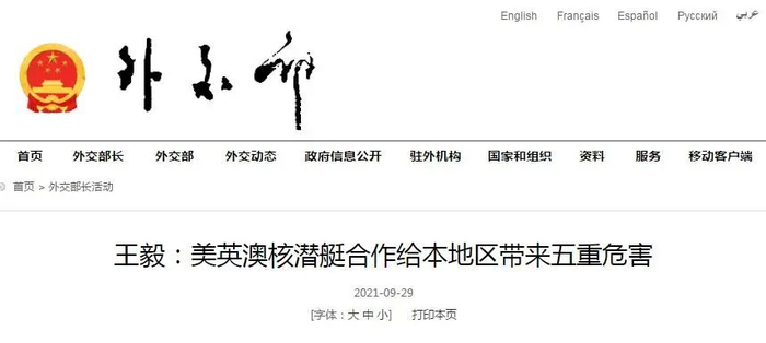 王毅:美英澳核潜艇合作给本地区带来五重危害