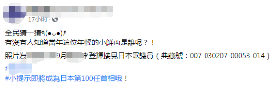 脸书帖文称,照片是1994年9月李登辉会见访台的日本众议员,接着还给出了一个“小提示”——“即将成为日本第100任首相”。