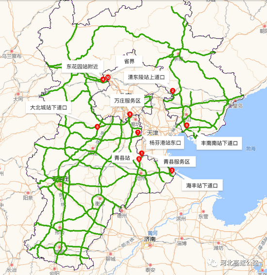 易堵位置有:京沪高速青县服务区附近、京藏高速京张段东花园站附近、京哈高速京秦段与唐津高速互通、京秦高速/清东陵支线清东陵站上道口、京昆高速保定段大北城站下道口等,如下图所示: