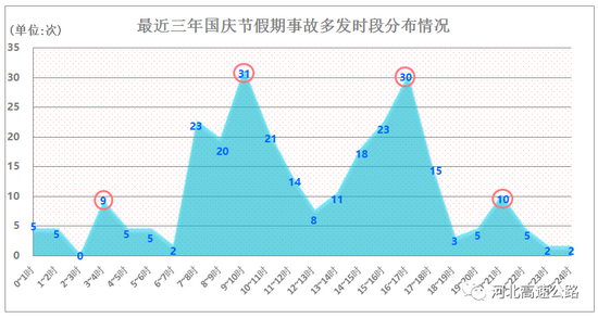 最近三年的10月1日,事故高发时段主要集中在车流量快速上升时段以及流量高位运行时段,主要是上午7点-11点以及下午14-17点。需要特别注意,凌晨3点左右虽然是一天中车流量最低的时段,却是一个事故高发时段;晚上20点左右也是一个低流量高事故率时段。具体分布如下图所示: