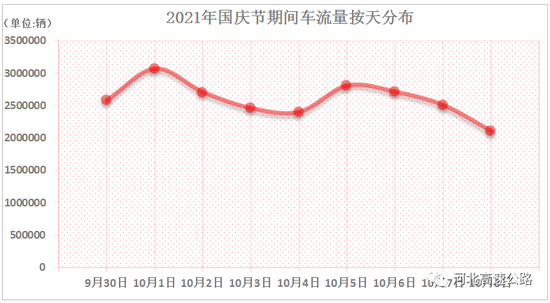 根据历史数据统计,国庆假期高速公路日均车流量较平日有较大的增长,并且整体上呈明显的潮汐特征。参考往年同期数据并结合今年流量走势和出行特征,国庆期间车流量按天分布情况如下图所示: