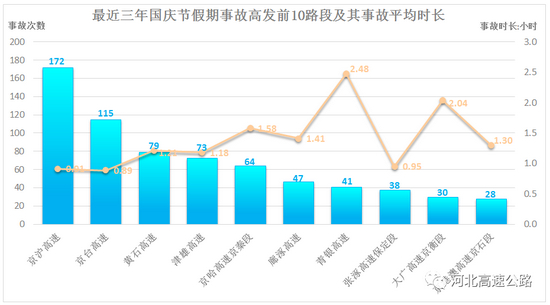最近三年国庆期间,事故累计发生次数排名前10的路段及其事故平均处置时长(柱状图为该路段累计事故次数、折线为事故平均处置时长),如下图所示。其中京沪、京台、黄石、京哈高速京秦段事故发生数量显著居前。