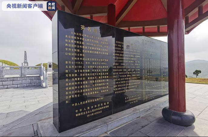 安州中国人民志愿军烈士陵园位于朝鲜安州市郊史元厚山上,共安葬烈士1156人。陵园内建有烈士英名墙铭刻着烈士姓名,以铭记中国人民志愿军先烈在抗美援朝战争中建立的不朽功勋,并不断传承和发展中朝友谊。(总台记者 董海涛)