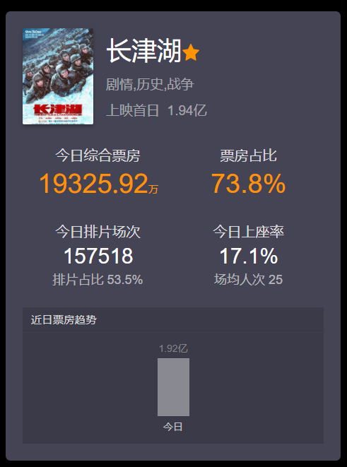 截至发稿,猫眼专业版数据显示,《长津湖》今天票房已达1.93亿。今天排片占比53.5%,上座率17.1%,场均人次25。
