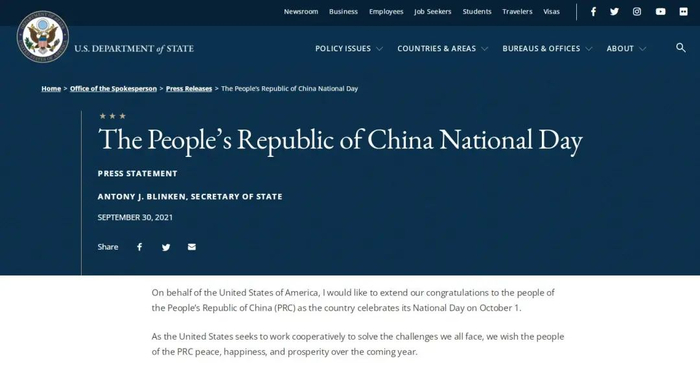 当地时间9月30日,美国国务院官网刊登了国务卿布林肯祝贺中国人民国庆节快乐的新闻声明。