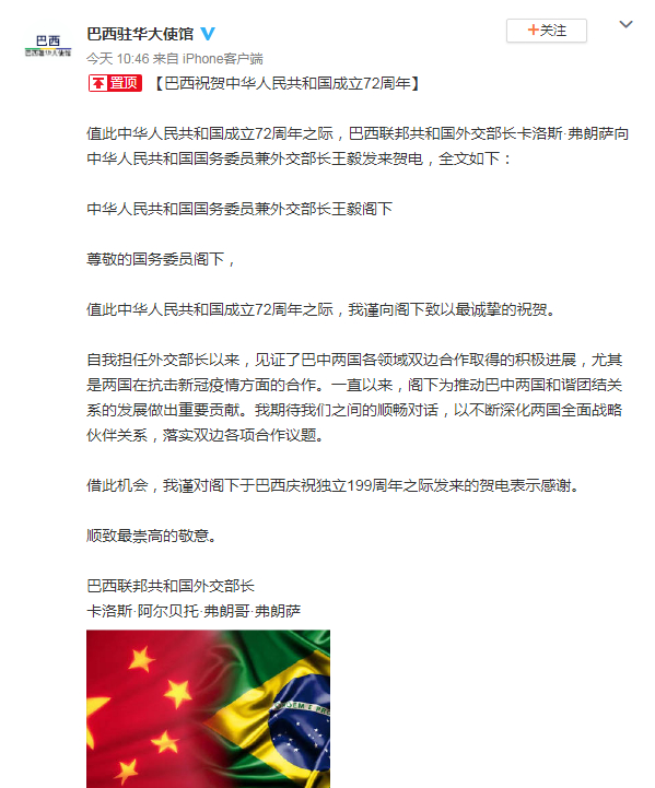 巴西驻华使馆微博发文:祝贺中华人民共和国成立72周年!