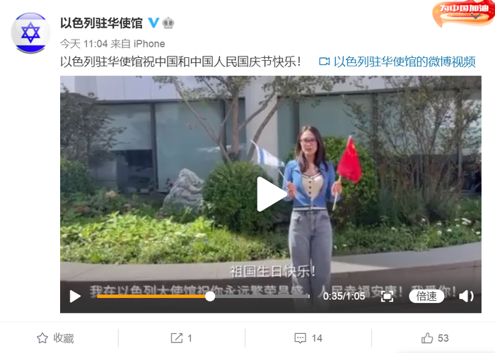 以色列驻华使馆微博发文:祝中国和中国人民国庆节快乐!