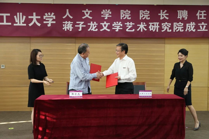 随后,校长夏长亮院士、蒋子龙先生共同签署合作建立蒋子龙文学艺术研究院框架协议并为研究院揭牌。校长夏长亮院士为蒋子龙先生颁发聘任证书并佩戴校徽。双方互赠了纪念品。