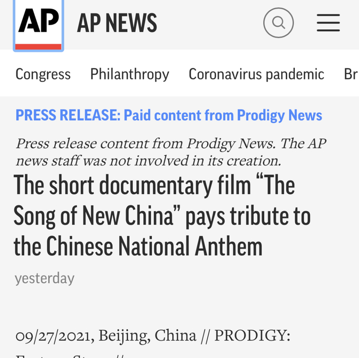 截至目前,《新中国之歌》已在紫光阁、共青团中央、人民日报、光明日报、央视频等国内上百家主流媒体、新媒体平台发出,并登上微博热搜,阅读讨论量近7000万。美联社、每日先驱报、雅虎新闻、WBOC电视台、bostonstar、2news等海外媒体也对短片进行了报道。