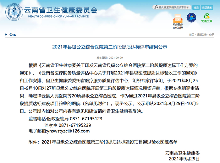 根据《云南省卫生健康委关于印发云南省县级公立综合医院第二阶段提质达标工作方案的通知》、《云南省医疗服务质量评估中心关于开展2021年县级医院提质达标验收工作的通知》和工作安排,省卫生健康委委托省医疗服务质量评估中心,组织专家评审组,于2021年8月25日-9月10日对27所县级公立综合医院开展第二阶段提质达标情况现场评审,根据专家组评审结果,确定祥云县人民医院等20所县级公立综合医院,作为通过2021年县级公立综合医院第二阶段提质达标建设项目验收的医院(名单见附件)。现予公示,公示期从2021年9月29日-10月5日。公示期内如对公示内容有意见和建议请向省卫生健康委反映。