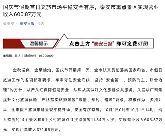 据泰安日报10月2日报道,10月1日0时至10月1日14时,纳入监测的14个景区和6个乡村旅游点共接待游客11.34万人次,实现营业收入605.87万元,实现门票收入371.96万元。全市假日旅游市场呈现平稳开场、安全有序态势。