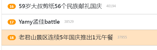10月1日,国庆长假第一天,河南洛阳老君山推出无人值守一元午餐 ,一元钱便可以管饱,吸引众多游客前来品尝。该事件当日登上微博热搜。