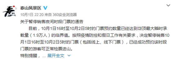 就在发稿前,每经小编刚注意到,泰山风景区于2日中午再次发布暂停销售夜间时段门票的通知,决定暂停销售10月2日16时至10月3日5时的门票。