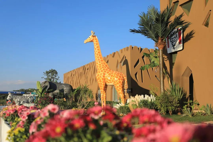 该服务区以非洲主题为核心元素设计,以单元式组团、独立立面系统、特色中庭式空间为主体整合升级,植入了大象、斑马、长颈鹿、火烈鸟等雕塑,融入“自然生态+人文关怀”的旅程体验,在“快进慢游”中为司乘人员打造沉浸式非洲风情体验。