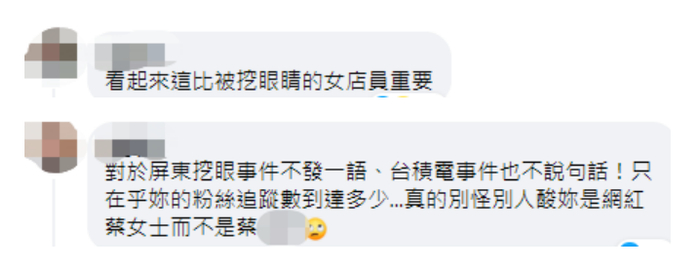 “看起来这比被挖眼睛的女店员重要。”有网友称,“对于屏东挖眼事件不发一语、台积电事件也不说句话!只在乎你的粉丝追踪数到达多少...真的别怪别人酸你是网红蔡女士。”