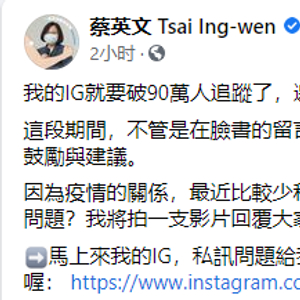 报道称,蔡英文在脸书帖文中除谢谢大家持续给她鼓励与建议,还声称因疫情的关系,最近较少和大家面对面接触,她问网友有没有想问的问题,她会拍视频回复。帖文最后,她贴出自己INS网址,提醒网友私讯问题给她时记得加上标签。