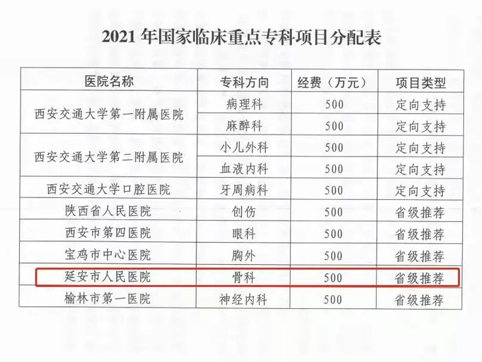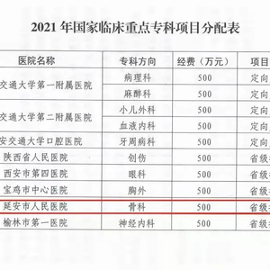 近日,陕西省卫健委办公室公布了2021年国家临床重点专科建设单位名单,中国医科大学延安医院(延安市人民医院)骨科被确定为国家临床重点专科建设单位,成为延安市唯一一家获此殊荣的医院。
