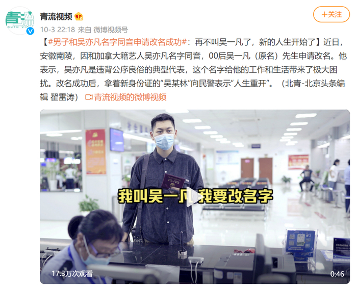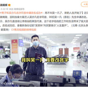 近日,安徽南陵,因和加拿大籍艺人吴亦凡名字同音,00后吴一凡(原名)先生申请改名。他表示,吴亦凡是违背公序良俗的典型代表,这个名字给他的工作和生活带来了极大困扰。改名成功后,拿着新身份证的“吴某林”向民警表示“人生重开”。