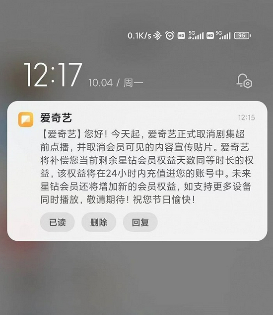 界面文娱发现,已经有星钻会员在网上晒出了自己收到的通知,该通知显示,爱奇艺将补偿当前剩余星钻会员权益天数同等时长的权益,并将在24小时内充值进会员账号中,未来星钻会员也将增加新的会员权益,如支持更多设备同时播放。